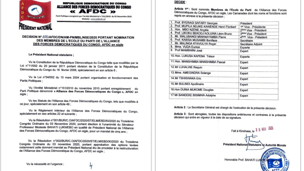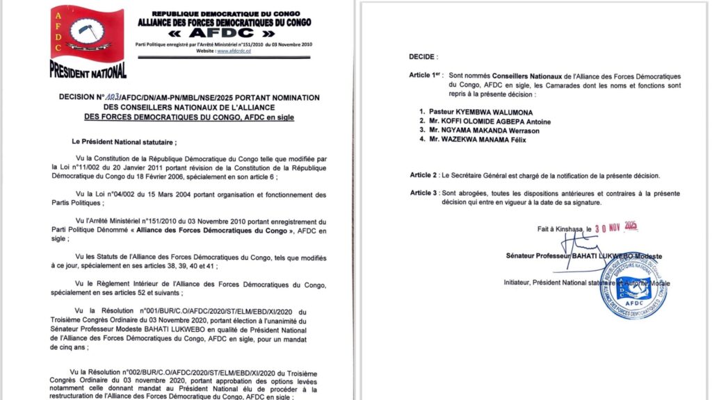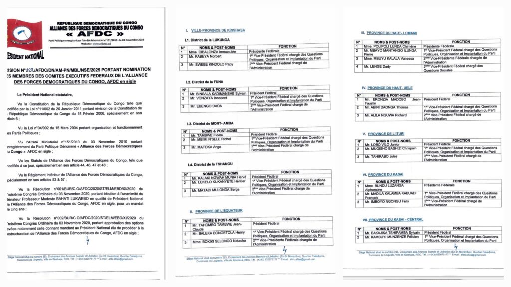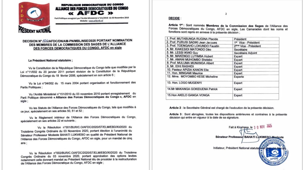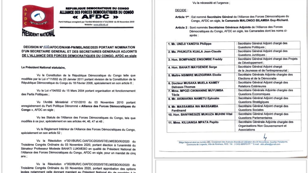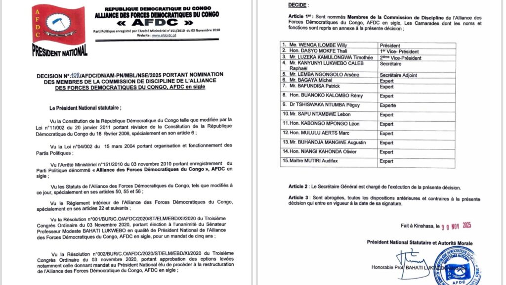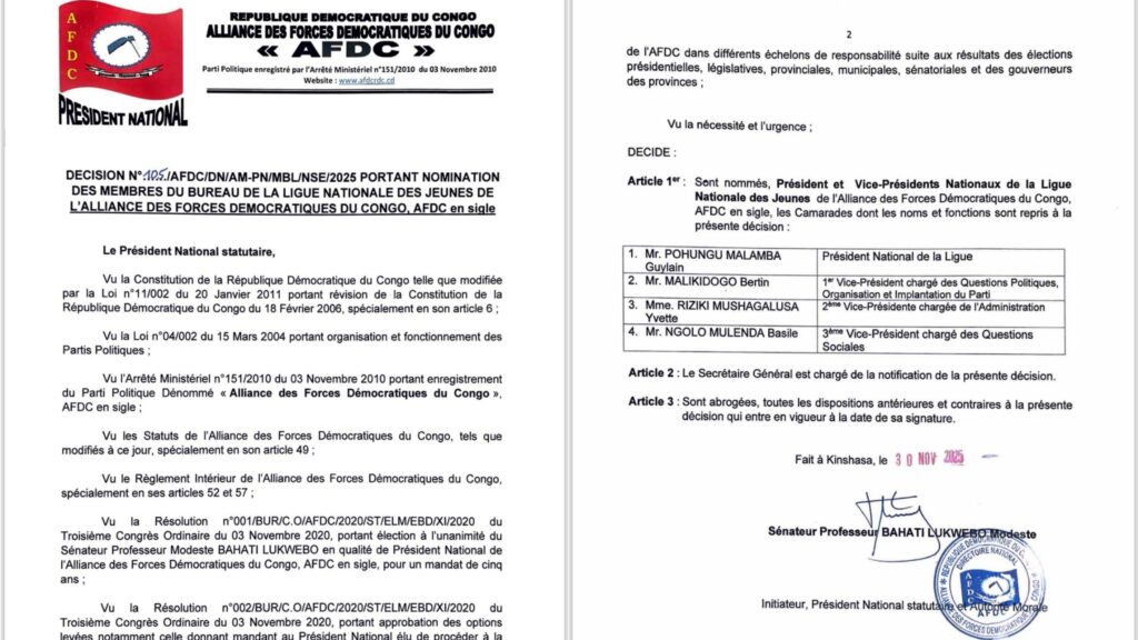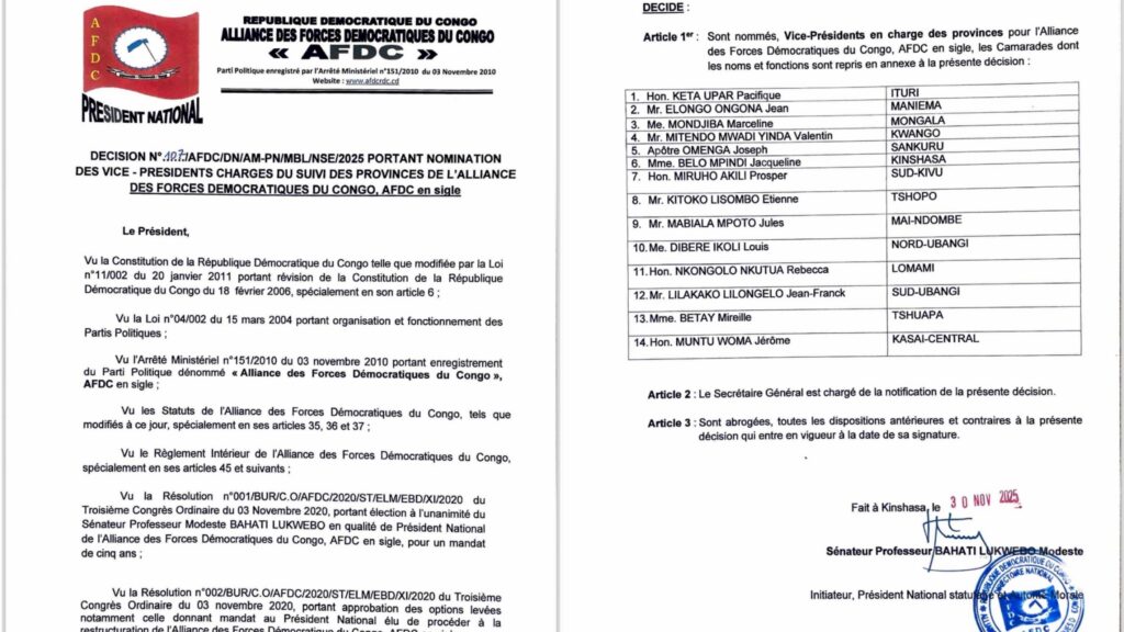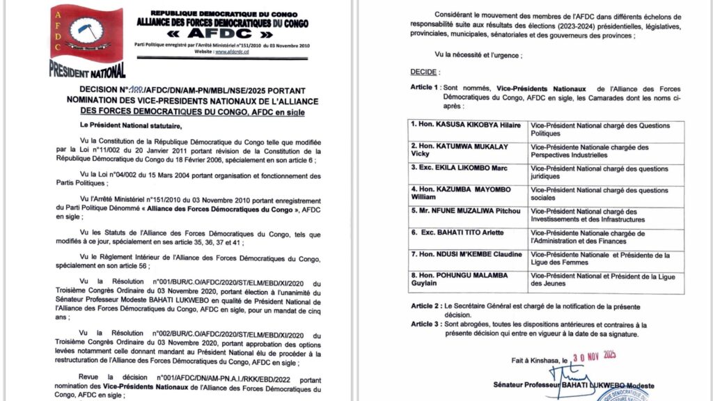 Dans une dynamique de restructuration interne et de consolidation de ses structures spécialisées, l’Alliance des Forces Démocratiques du Congo (AFDC) a procédé ce 1 janvier 2026 à un remaniement significatif de ses animateurs à tous les niveaux. Ce mouvement, initié par le Président National statutaire, le Sénateur Professeur Modeste Bahati Lukwebo, s’inscrit dans le cadre du mandat de redynamisation confié lors du Troisième Congrès Ordinaire du 3 novembre 2020.
