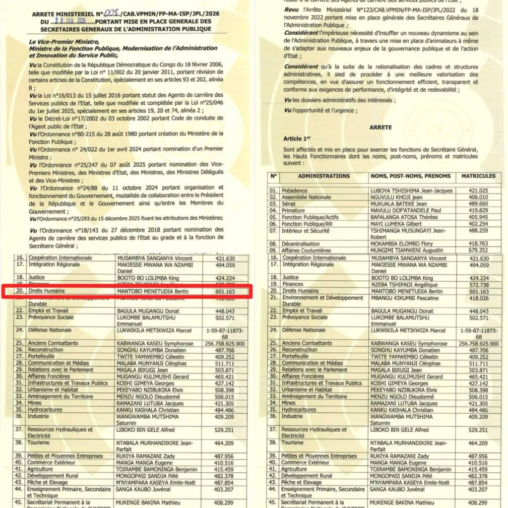 Le Vice-Premier Ministre et Ministre de la Fonction Publique, Modernisation de l’Administration et Innovation du Service Public, Jean-Pierre Lihau Ebua, a récemment signé l’arrêté ministériel n°008./CAB.VPMIN/FP-MA-ISP/JPL/2026, officialisant la mise en place générale des Secrétaires Généraux de l’administration publique.